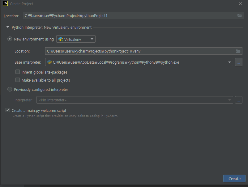 먼저, 프로젝트를 가상환경을 이용해 새로운 프로젝트를 만듭니다.
