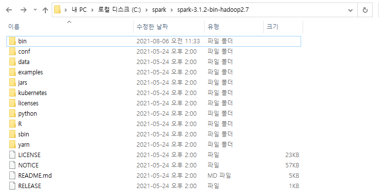 - spark-3.2.1-bin-hadoop2.7.tgz를 다운 받아 압축풀기