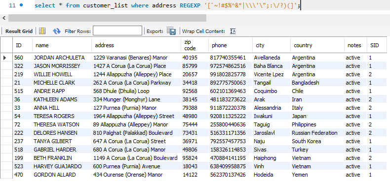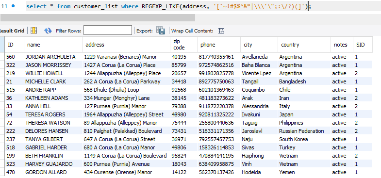 address 컬럼이 특수기호가 들어간 row만 출력