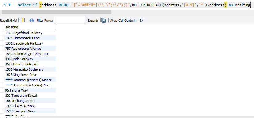 IF, RLIKE, REGEXP_REPLACE를 활용하여 다음과 같이 address컬럼에 특수기호가 들어가 있는 row에 숫자를 마스킹 처리 하도록 표현할 수도 있다.
