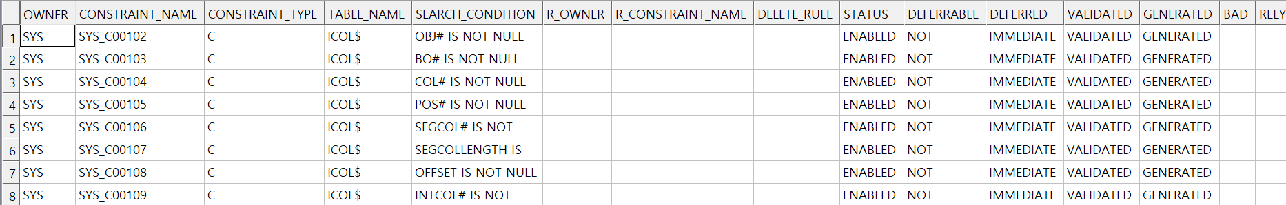 FROM DBA_CONSTRAINTS; -- 데이터베이스 내의 모든 제약조건 목록