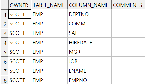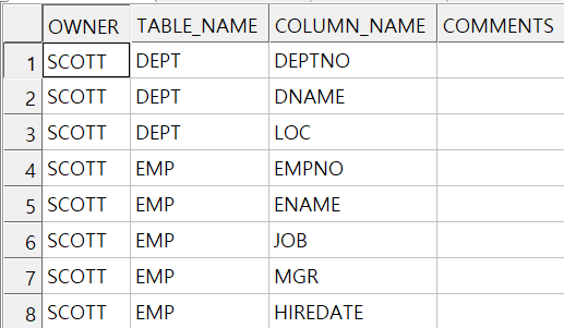 FROM DBA_COL_COMMENTS; -- 데이터베이스 내의 모든 컬럼과 코맨트