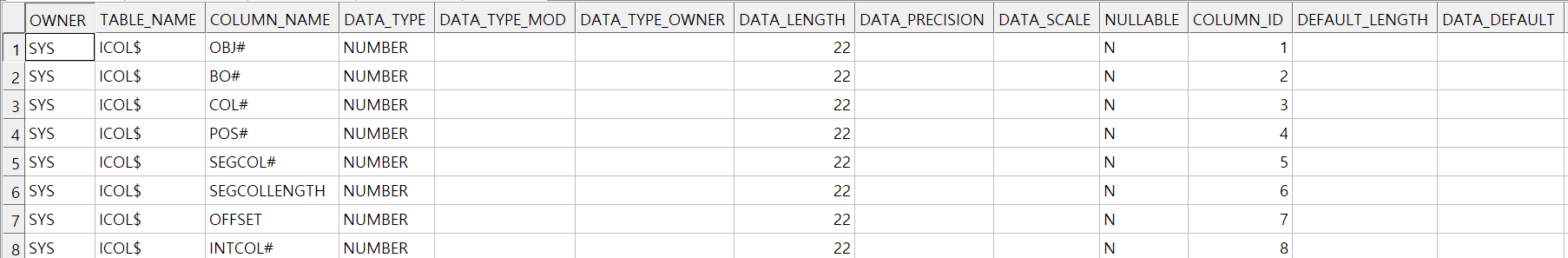 FROM ALL_TAB_COLUMNS; -- 유저가 소유한 컬럼, 유저가 접근 가능한 컬럼 목록(숨겨진 컬럼 제외)