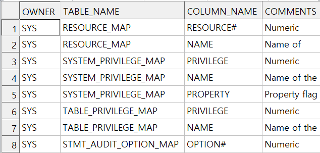 FROM ALL_COL_COMMENTS; -- 유저가 소유하거나 접근가능한 모든 컬럼과 코맨트