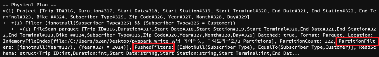 PushedFilters는 스캔하기 전 필터가 되는 컬럼과 값을 명시하고 있다.
