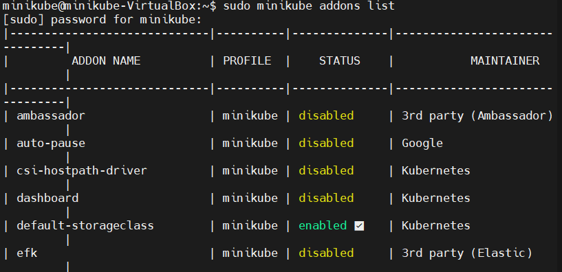 sudo minikube addons list