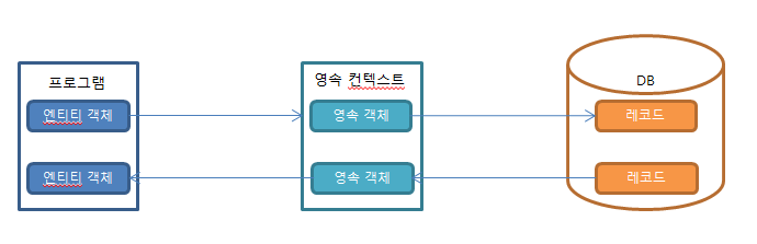 속한 엔티티를 검색하거나 삭제 또는 추가, 변경하는 작업을 하면 영속 컨텍스트의 내용이 DB에 반영되는 것이죠.