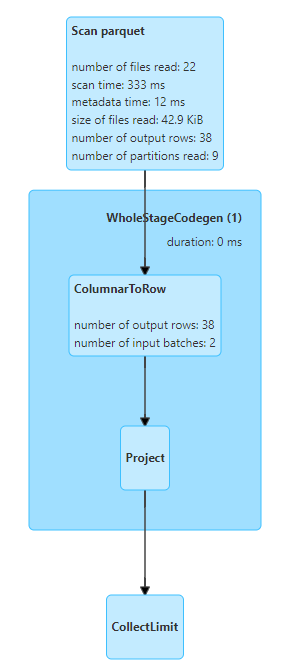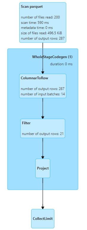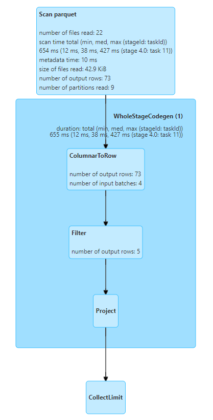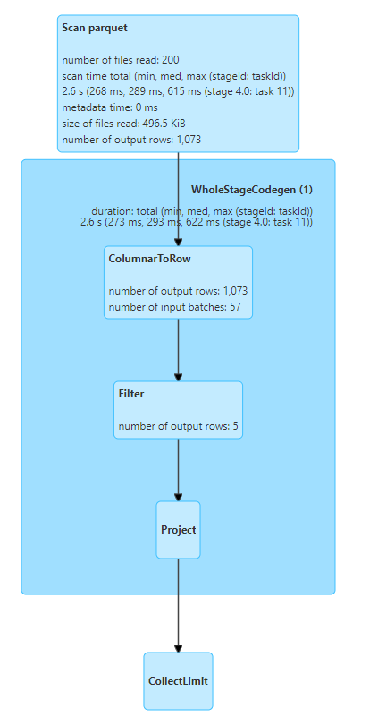 - parquet는 columnar format으로 batch 단위로 데이터를 처리하는데, action에 사용되는 row 수에 따라 batch 수가 정해지며, 읽는 row수도 달라짐(csv는 action에 쓰이는 row 수랑 동일하게 row를 읽음)