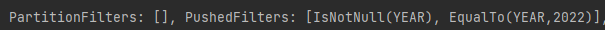 파티션(디스크)되지 않은 데이터에 "YEAR ==2022" 조건으로 실행계획을 확인하면 PartitionFilters가 아닌 PushedFilters에 설정한 조건이 나옴
