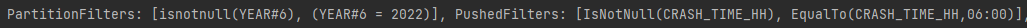 df_partition.where((F.col("YEAR")=="2022") & (F.col("CRASH_TIME_HH")=="06:00")).explain()