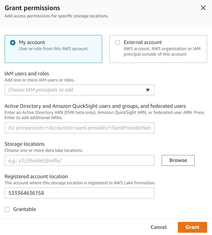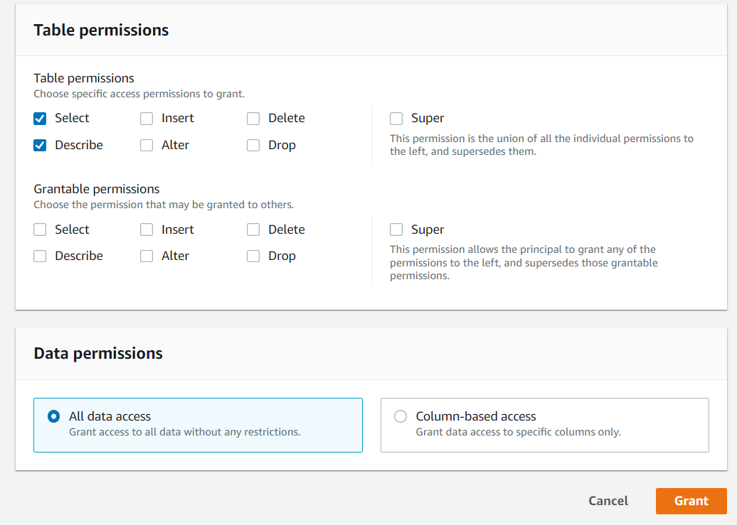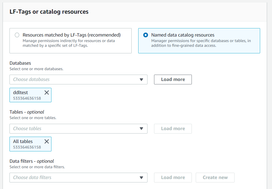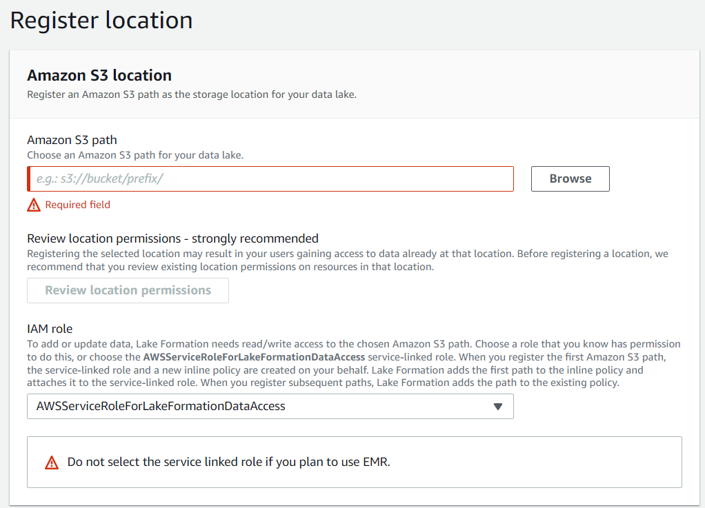 - S3에 대한 접근 권한의 제어(Data Locations)도 Lake Formation에서 진행하기 때문에 해당 권한은 명시할 필요 없음