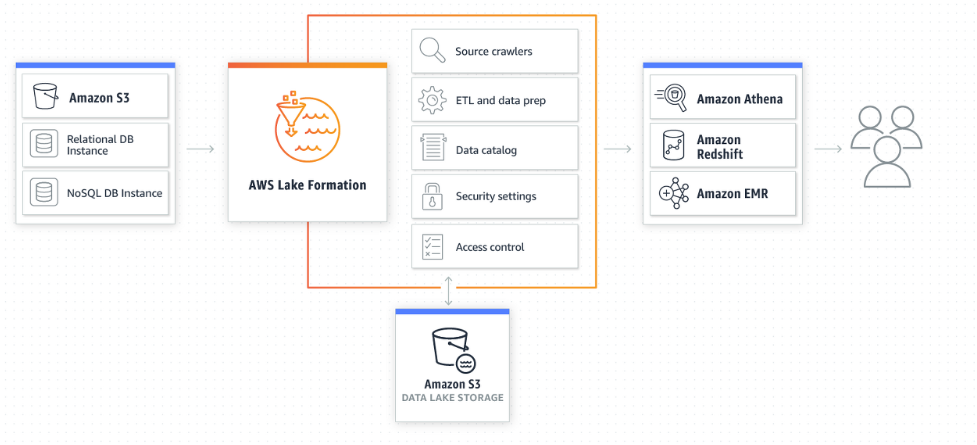 - 사용자가 데이터 소스를 설정하기만 하면, lakeformation은 소스를 크롤링(Glue crawler)하여 데이터를 S3 데이터 레이크로 이동