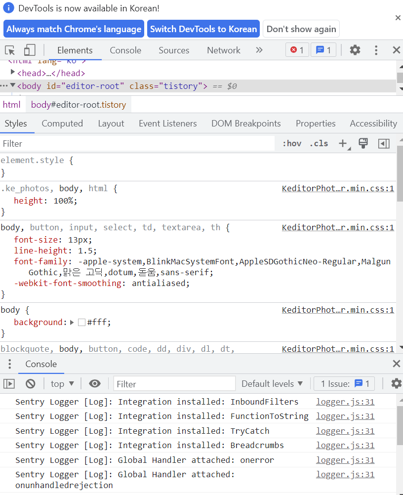 Element 패널은 html 코드를 분석하고 수정할 수 있는 도구 패널이며, Dom과 css를 자유롭게 조작하여 사이트의 레이아웃과 디자인을 테스트 할 수 있습니다.