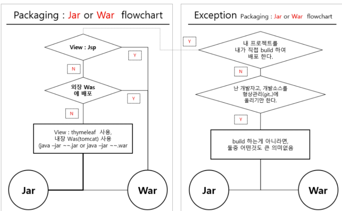 - Spring boot에서는 JSP, 외장 톰캣을 사용하지 않으므로 JAR가 표준