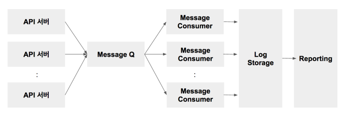 | Message Consumer | MQ 로 부터 로그를 Message Consumer 가 순차적으로 읽어서 Log Storage에 저장 | Multi Thread(or Process) + Timer 를 조합하여 메시지를 폴링 방식으로 읽어오는 어플리케이션 |