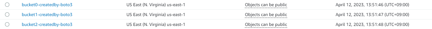 AWSboto3.create_bucket(bucket_name=f'bucket{i}-createdby-boto3',region='us-east-1')