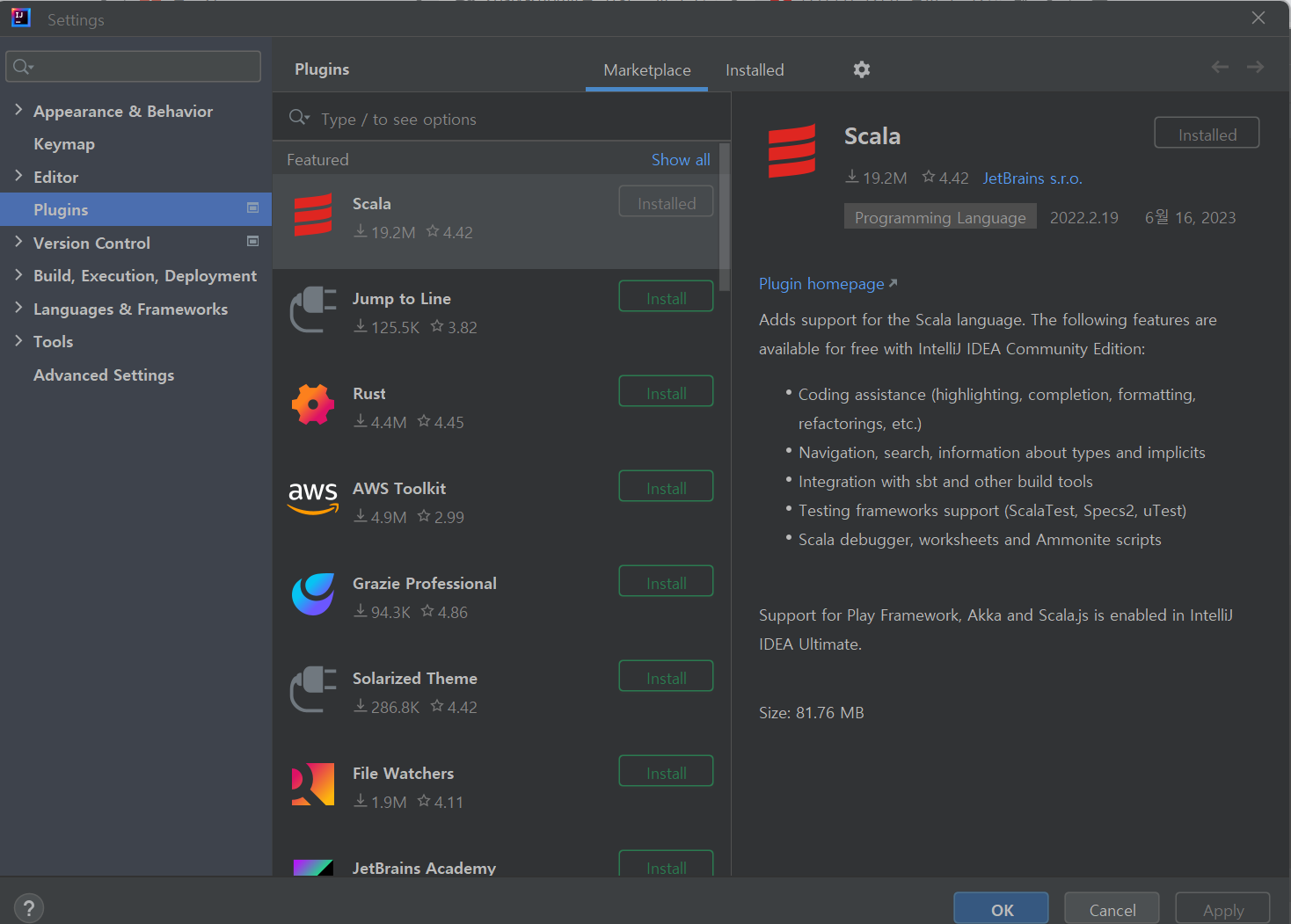 settings에서 scala plugins생성