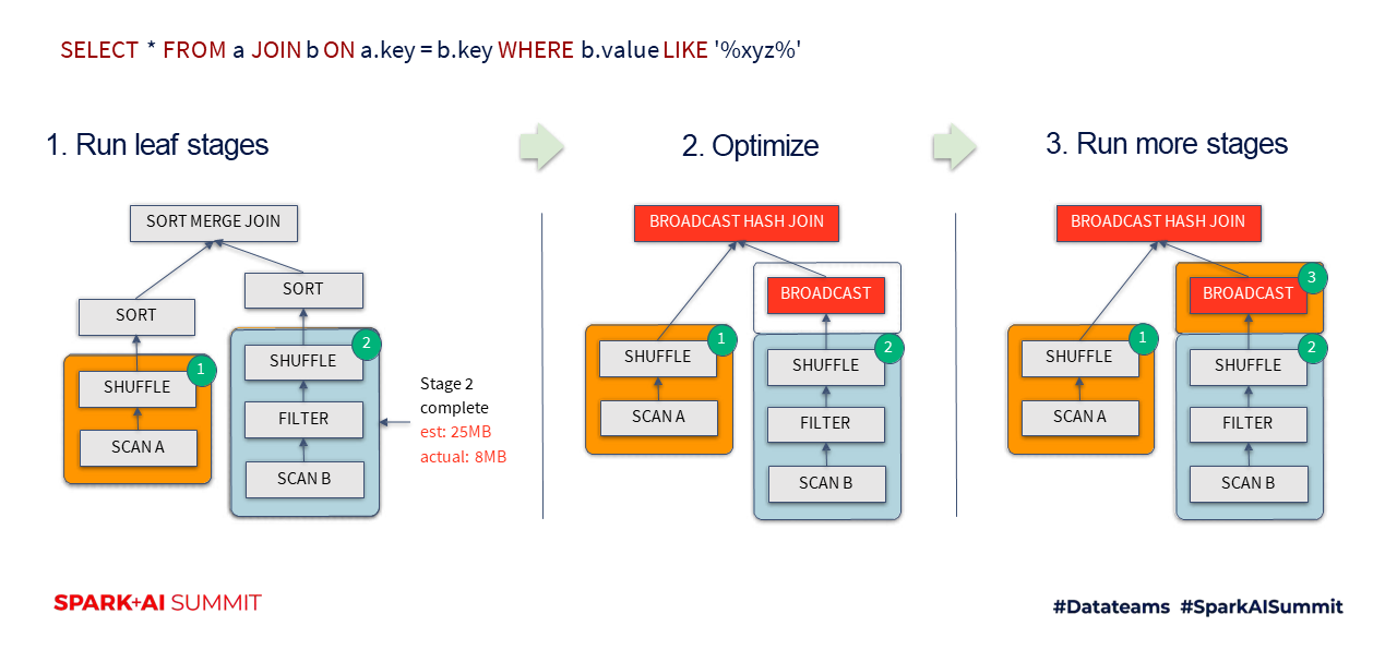 - Table에 대한 Scan Stage가 끝난 후 남은 쿼리에 대해서, Table 데이터 사이즈가 broadcast할 수 있을 만큼 작다면 Sort-merge join에서 Broadcast-hash join으로 Plan을 변경함