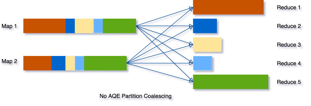 - 처음에는 Shuffle Partition갯수를 크게 잡은 후 Shuffling Stage수행 후 Data Size가 작은 Partition을 하나의 파티션으로 묶어서 Reduction Stage의 Partition수를 줄임(1) 5개 partition으로 column j를 key로 shuffling을 수행