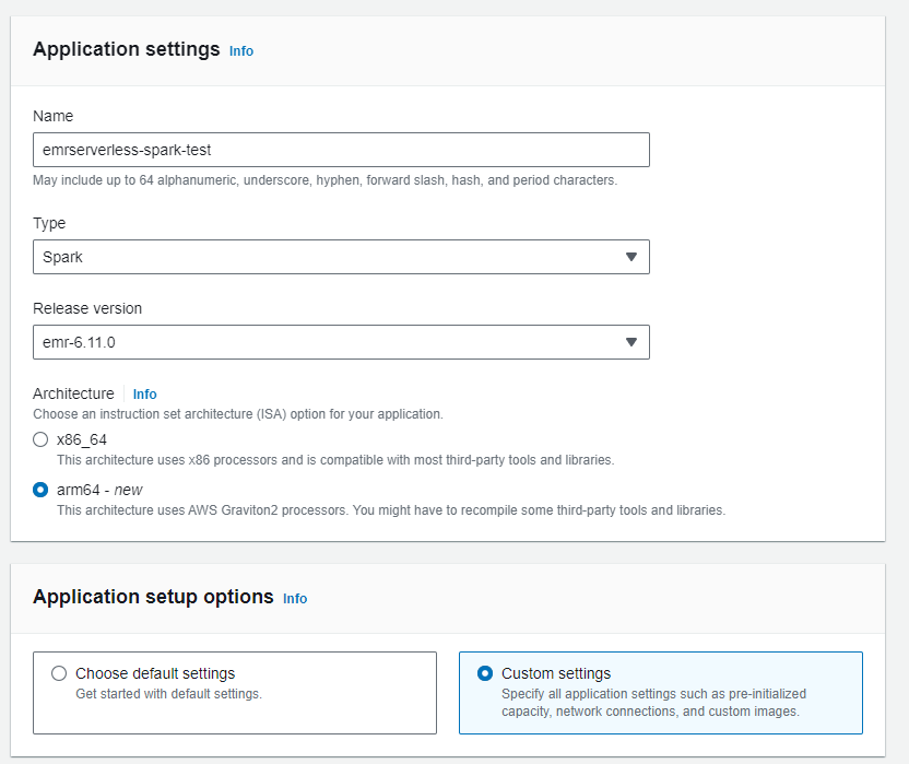 APP 생성 UI를 보면 이름 넣는 란, Job 종류(Spark, Hive), EMR version을 선택할 수 있고 Architecture를 선택할 수 있습니다.