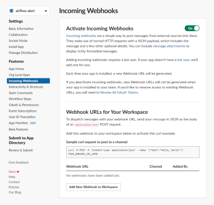Incoming Webhooks 선택 > On > Add New Webhook to Workspace > 채널 선택 > 허용(ON)