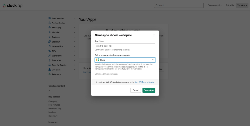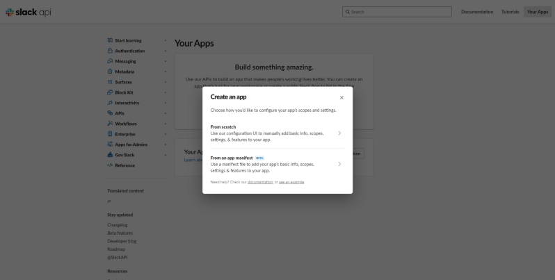 From scratch > 앱이름(소문자와 '-'로 구성) 과 슬랙 워크스페이스 선택 > Create App