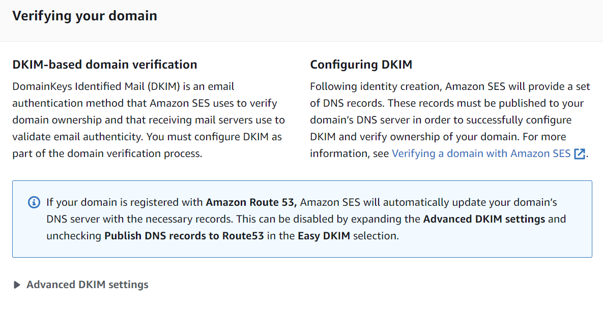 - 또한 도메인이 Amazon Route53에 등록되어 있다면, Amazon SES는 자동적으로 도메인의 DNS 서버와 필수적인 레코드들을 업데이트하게 됩니다.