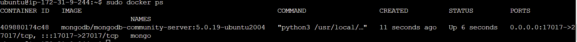 sudo docker run --name mongo -d -p 17017:27017 -e MONGO_INITDB_ROOT_USERNAME=test -e MONGO_INITDB_ROOT_PASSWORD='test!!' -v volume_name:/data/db mongodb/mongodb-community-server:5.0.19-ubuntu2004