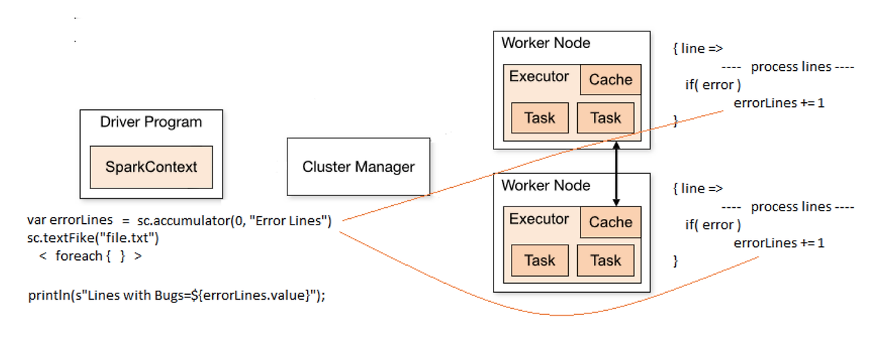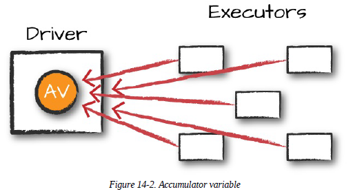 - 어큐뮬레이터의 값은 액션을 처리하는 과정에서만 갱신, 각 태스크에서 어큐뮬레이터를 한 번만 갱신하도록 제어 → 재시작한 태스크는 어큐뮬레이터값을 갱신할 수 없음, 트렌스포메이션에서 태스크나 잡 스테이지를 재처리하는 경우 각 태스크의 갱신 작업이 2번 이상 적용될 수 있음