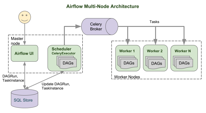 Airflow Multi-Node Architecture도 크게 다를 바는 없는데, 여기서 다수의 worker를 다룰 Celery Broker와 Redis, RabbitMQ같은 Queue가 추가적으로 필요합니다.(Flower와 같은 Celery monitoring 도구는 옵션)