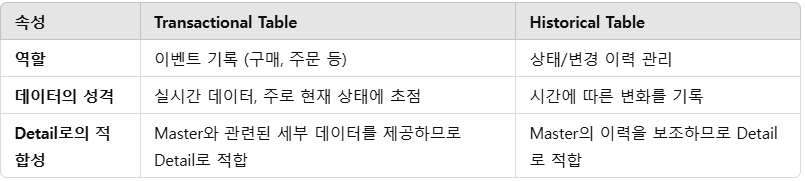 - Historical Table: 시간에 따른 Master 테이블 엔터티의 상태 변경 이력을 저장하며, Detail 테이블의 역할 수행