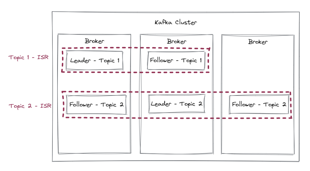 ex) 특정 topic이 replication factor 2로 구성되어 리더는 1번 브로커, 팔로워는 2번 브로커에 위치하고 잇따면, ISR 구성원은 1,2 이고, 브로커 1이 다운되면, ISR의 구성원인 2번 브로커에 있는 팔로워가 새로운 리더로 승격하게 됨 - 리더와 팔로워의 데이터 동기화를 유지하는 역할
