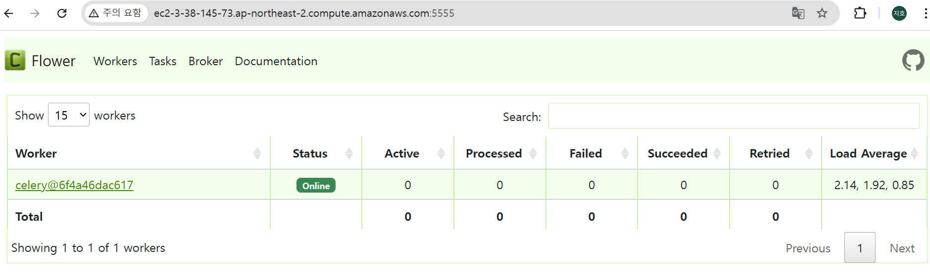 EC2 publicDNS:5555로 접속(flower)