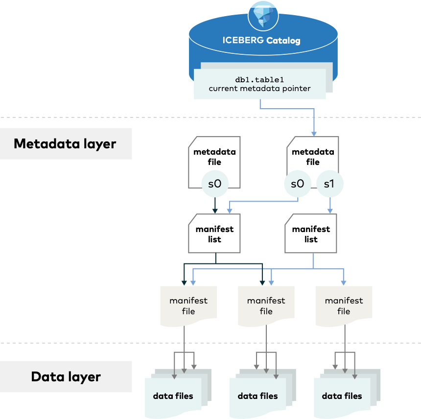 - Manifest 파일이 이 데이터 파일들의 위치와 메타정보를 관리.