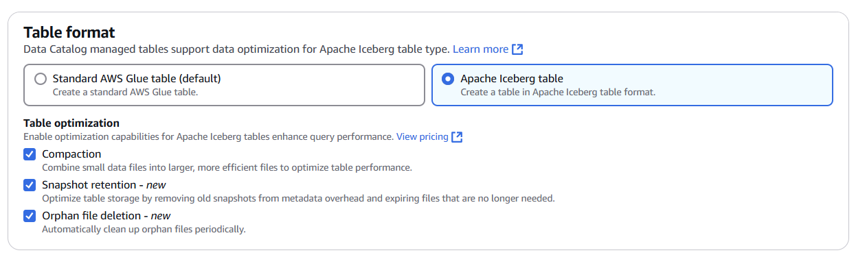 AWS Glue Table format에서 Apahce Iceberg table을 선택해서 생성할 수 있습니다.