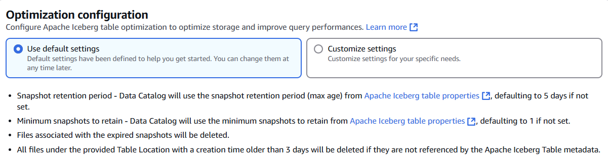 최적화와 관련된 configuration을 기본값을 사용할 수도 있고, 커스텀 셋팅을 사용할 수도 있습니다.