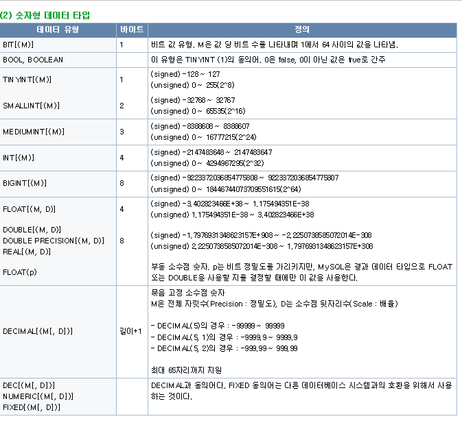 문자형 타입의 경우,M은 최대 사용가능 갑은 데이터 타입에 따라 다르다.