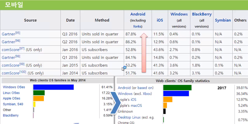 Linux 기반의 Android + Unix 기반의 IOS 두개의 점유율을 합치면 거의 100%에 육박합니다. 그렇다면