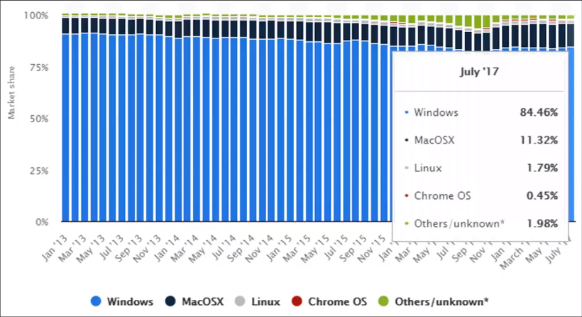 2017년 기준 Windows가 압도적으로 높은 점유율을 가지고 있습니다. 그에 반해 Linux는 1.79%로 저조한 점유율을 가지고 있습니다. 유닉스의 기반인 MacOS를 봐도 11.32% 두 개를 합쳐도 매우 낮은 점유율을 가지고 있습니다. 하지만 모든 사용자의 점유율은 Window가 압도적입니다.