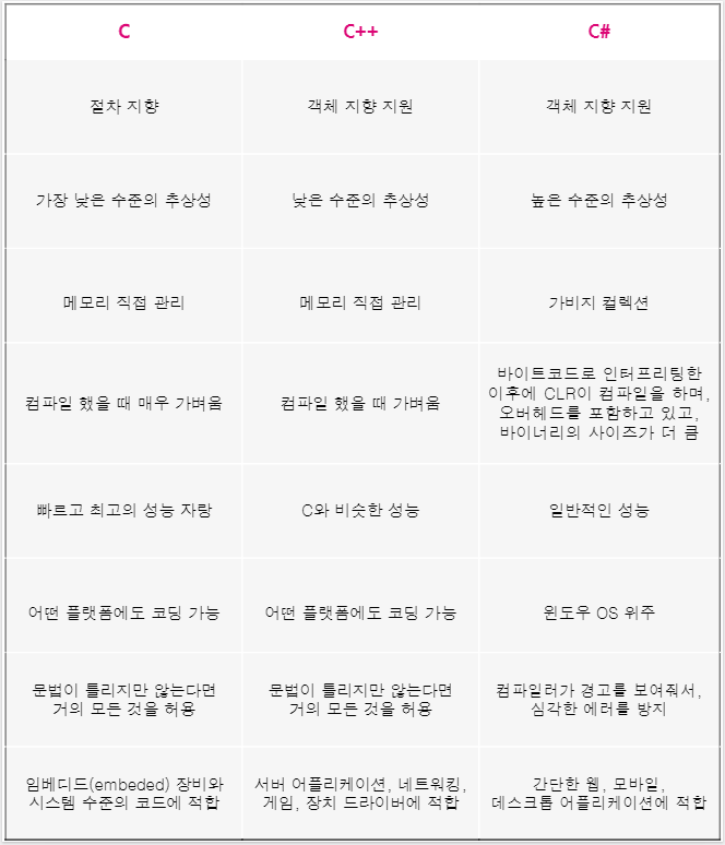 C++과 C#이 비슷한 언어라고 하기 힘든 이유는, 이 두 언어가 비슷한 점보다는 다른 점이 훨씬 더 많기 때문입니다. 겉으로 보이는 문법만 비슷한 것이지, 그 이면까지 비슷하다고 보기는 어려운데요. 두 언어의 다른 특성들로는 다음과 같은 점들이 있습니다.