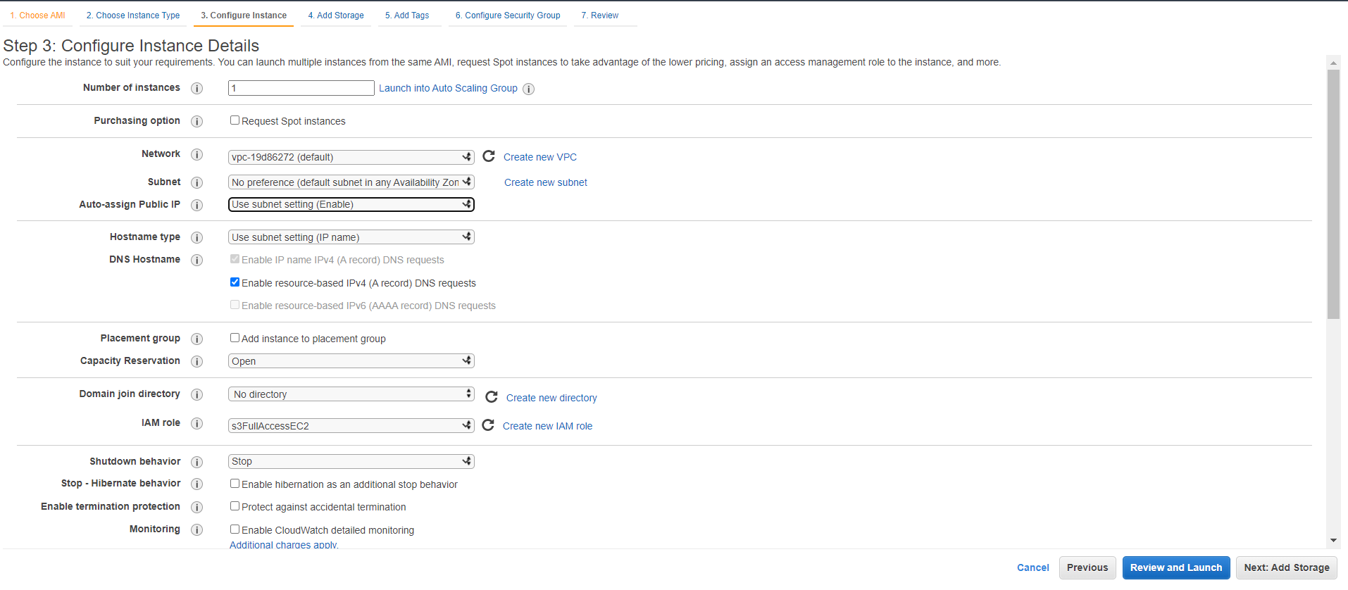 public IP를 부여할 수 있게 Use subnet setting(Enable), IAM role을 S3Full Access 권한으로 하나 만들어 부여해줍니다.
